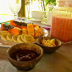 A selection of options including fruit, juice, and cheese are served for breakfast, and breakfast in the room is also available.