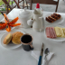 A selection of options including fruit, juice, and cheese are served for breakfast, and breakfast in the room is also available.