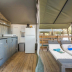 The air-conditioned luxury tent also has a fully equipped kitchenette with a fridge, a seating area, and a bathroom with a shower.