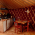 The yurt offers mountain views and features a private bathroom with a hydro-massage shower and dry toilet. The kitchen is equipped with stove and oven and refrigerator. There is also a fireplace and wood is provided.