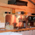 The units have a fully equipped kitchen with dining area, a fridge, coffee machine, and a stovetop.