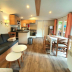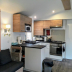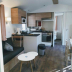 The units have a fully equipped kitchen with dining area, a fridge, coffee machine, and a stovetop.