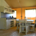 The units have a fully equipped kitchen with dining area, a fridge, coffee machine, and a stovetop.