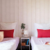 The units have a fully equipped kitchen with dining area, a fridge, coffee machine, and a stovetop.