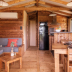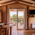 This wooden caravan comes with air conditioning, a private bathroom with shower and toilet, and BBQ facilities. They all have a fully equipped kitchen and a dining area.
