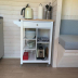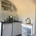 The kitchen is equipped with a fridge, a stovetop and a toaster, as well as a coffee machine and an electric tea pot.