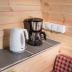The kitchen is equipped with a fridge, a stovetop and a toaster, as well as a coffee machine and an electric tea pot.