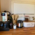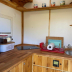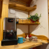 The kitchen is equipped with a fridge, a stovetop and a toaster, as well as a coffee machine and an electric tea pot.