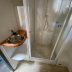 A fridge and a stovetop can be found in the kitchen and there's a bathroom with shower and a hairdryer.