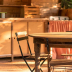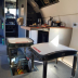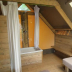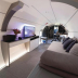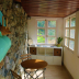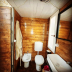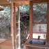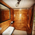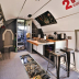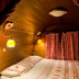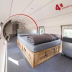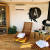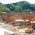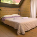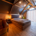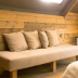 The apartment has either a balcony or terrace, a separate living/dining room with sofa, and a bathroom. It has wood-paneled ceilings and tiled floors.