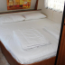 The apartment has either a balcony or terrace, a separate living/dining room with sofa, and a bathroom. It has wood-paneled ceilings and tiled floors.