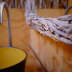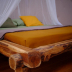 The apartment has either a balcony or terrace, a separate living/dining room with sofa, and a bathroom. It has wood-paneled ceilings and tiled floors.
