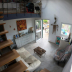 The apartment has either a balcony or terrace, a separate living/dining room with sofa, and a bathroom. It has wood-paneled ceilings and tiled floors.