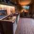 The apartment has either a balcony or terrace, a separate living/dining room with sofa, and a bathroom. It has wood-paneled ceilings and tiled floors.
