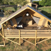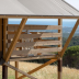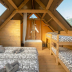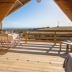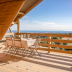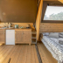 The apartment has either a balcony or terrace, a separate living/dining room with sofa, and a bathroom. It has wood-paneled ceilings and tiled floors.