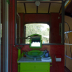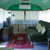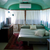 The apartment has either a balcony or terrace, a separate living/dining room with sofa, and a bathroom. It has wood-paneled ceilings and tiled floors.