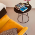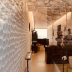 The apartment has either a balcony or terrace, a separate living/dining room with sofa, and a bathroom. It has wood-paneled ceilings and tiled floors.