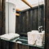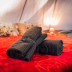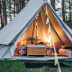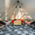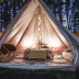 Towels and bed linen are featured in the campground. There's also a seating area and a fireplace.