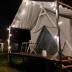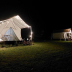Towels and bed linen are featured in the campground. There's also a seating area and a fireplace.