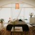 Towels and bed linen are featured in the campground. There's also a seating area and a fireplace.