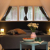 Towels and bed linen are featured in the campground. There's also a seating area and a fireplace.