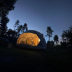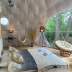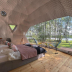The air-conditioned luxury tent also has a fully equipped kitchen with a fridge, a seating area, and a bathroom with a shower.