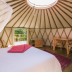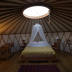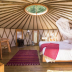 The luxury tent also includes a seating area and a bathroom with a bath or shower.