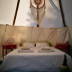 The luxury tent also includes a seating area and a bathroom with a bath or shower.