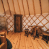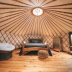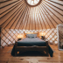 The luxury tent also includes a seating area and a bathroom with a bath or shower.