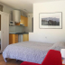 The kitchenette is equipped with a microwave, coffee machine, and fridge. The private bathroom includes a bath tub or a shower. Towels and bed linen are provided.