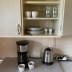 There's a fully equipped kitchen with a stovetop and coffee machine.