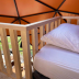 The luxury tent also provides a fully equipped kitchen with a fridge, a seating area, and a bathroom with a shower.
