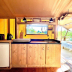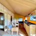 The luxury tent also has a fully equipped kitchen with a fridge, a seating area, and a bathroom with a shower.