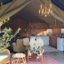 The luxury tent also has a fully equipped kitchen with a fridge, a seating area, and a bathroom with a shower.