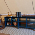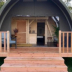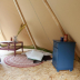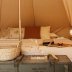 The luxury tent also has a fully equipped kitchen with a fridge, a seating area, and a bathroom with a shower.