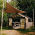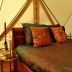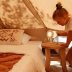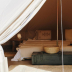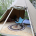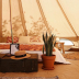 The luxury tent also provides a fully equipped kitchen with a fridge, a seating area, and a bathroom with a shower.