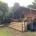 The luxury tent also provides a fully equipped kitchen with a fridge, a seating area, and a bathroom with a shower.