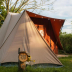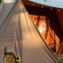 The luxury tent also provides a fully equipped kitchen with a fridge, a seating area, and a bathroom with a shower.