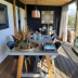 The luxury tent also has a fully equipped kitchen with a fridge, a seating area, and a bathroom with a shower.