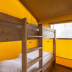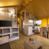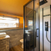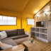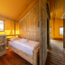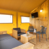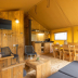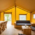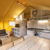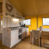 The luxury tent also has a fully equipped kitchen with a fridge, a seating area, and a bathroom with a shower.