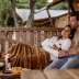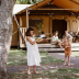 The luxury tent also provides a fully equipped kitchen with a fridge, a seating area, and a bathroom with a shower.