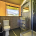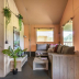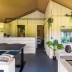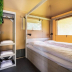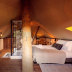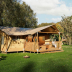 The luxury tent also has a fully equipped kitchen with a fridge, a seating area, and a bathroom with a shower.