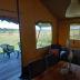 The luxury tent also has a fully equipped kitchen with a fridge, a seating area, and a bathroom with a shower.