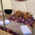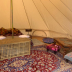 The luxury tent also has a flat-screen TV, a seating area, and a bathroom with a shower.