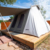 Providing a patio with city views, this luxury tent also offers a kitchen and a bathroom with a shower.